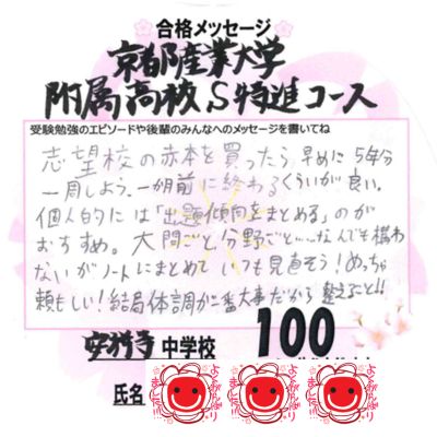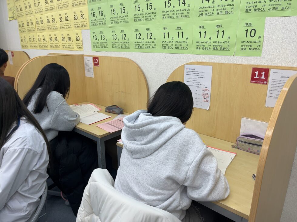 また、中学3年の夏の陣、冬の陣、天王山では、夜まで残ってしんどかったけどこのしんどかったことが受験に良い方向に響いて無事に志望校に合格しました。
