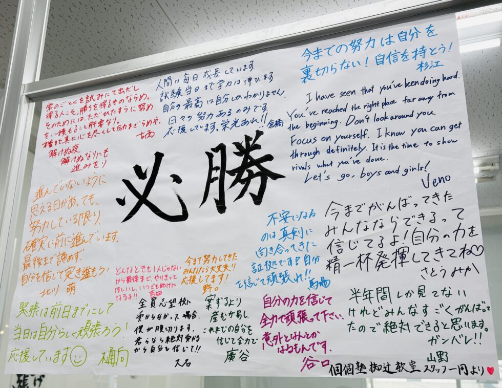 学校から直接塾に来て6コマ目までずっと自習をするという生活を続けていて、やっと前期で合格することができました。 私は元々勉強が本当に苦手で、夏からずっと塾に来て入試の練習をしていました。入試本番では、自分を疑ってしまって失点してしまったけれど、最後まで自分を信じて合格することができました。 最後まで自分を信じて!!ガンバレ!! 合格おめでとう!
