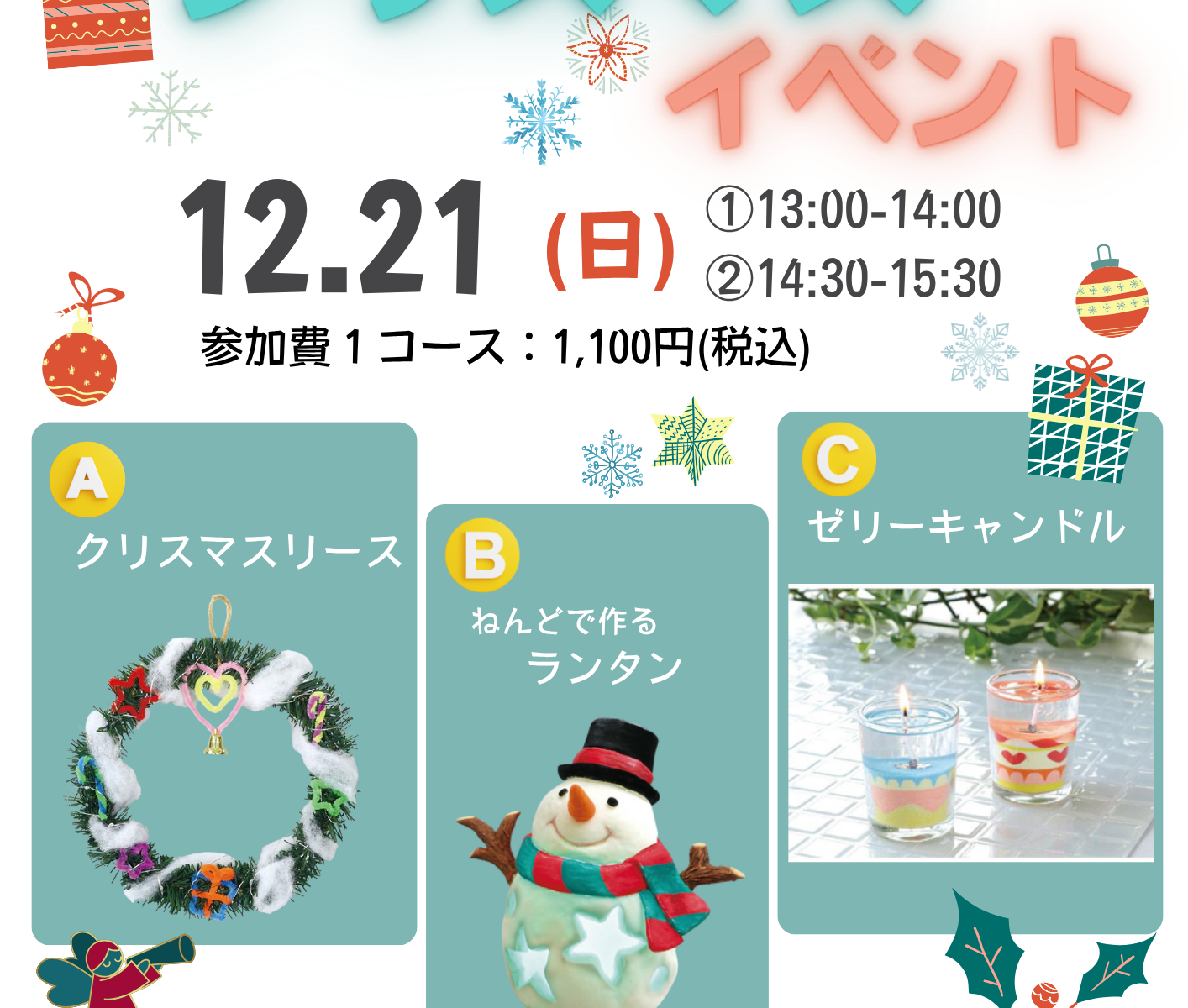 この冬、ココキッズクラブ六地蔵教室では、昨年に引き続き『クリスマスイベント』を開催いたします! 選べる3つのコース A.クリスマスリース モールや飾りをつけてオリジナルリースを作りましょう! B.ねんどで作 …