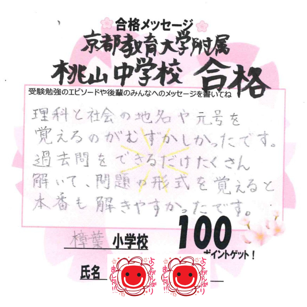 京都教育大附属桃山中学校 合格|樟葉小6 Fさん