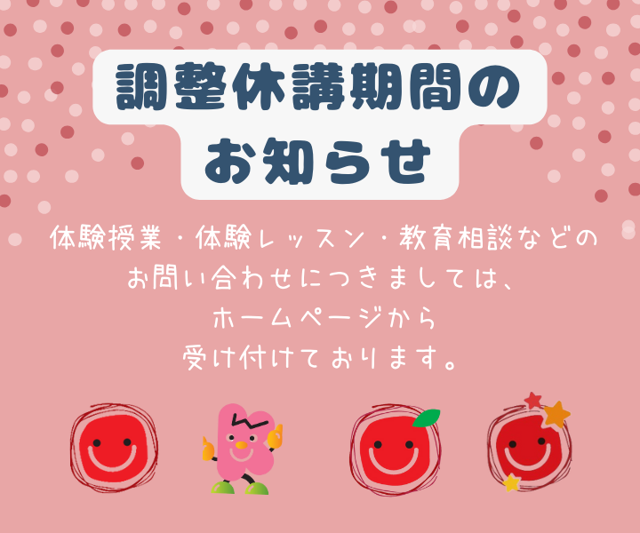 個個塾グループのホームページへお越しいただきありがとうございます。 2025年8月11日(月)~8月16日(土)は、調整休講期間となります。 授業・レッスン・自習等全てお休みですのでご注意ください。 ▼個個塾グループ会員 …