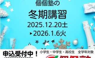 冬の勉強どうする? 時間の使い方が重要な冬。 短く限られて時間だからこそ、どう勉強するかが重要になります。 総復習や、3学期の予習、大事な受験対策も… 個個塾の先生たちが一緒に考えて全力でサポートします! お問い合わせは … 続きを読む 2025冬期個別講習会のご案内|個個塾グループ