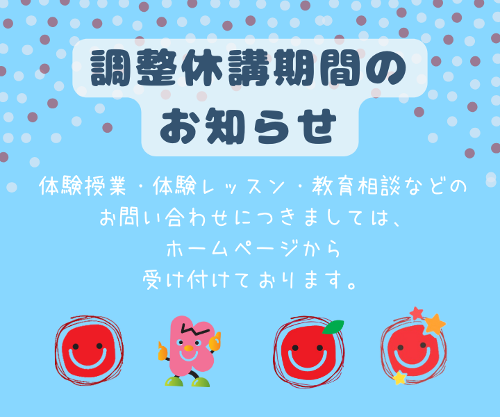 個個塾グループのホームページへお越しいただきありがとうございます。 2025年12月31日(水)~2026年1月4日(日)は、調整休講期間となります。 授業・レッスン・自習等全てお休みですのでご注意ください。 ▼お通いの …