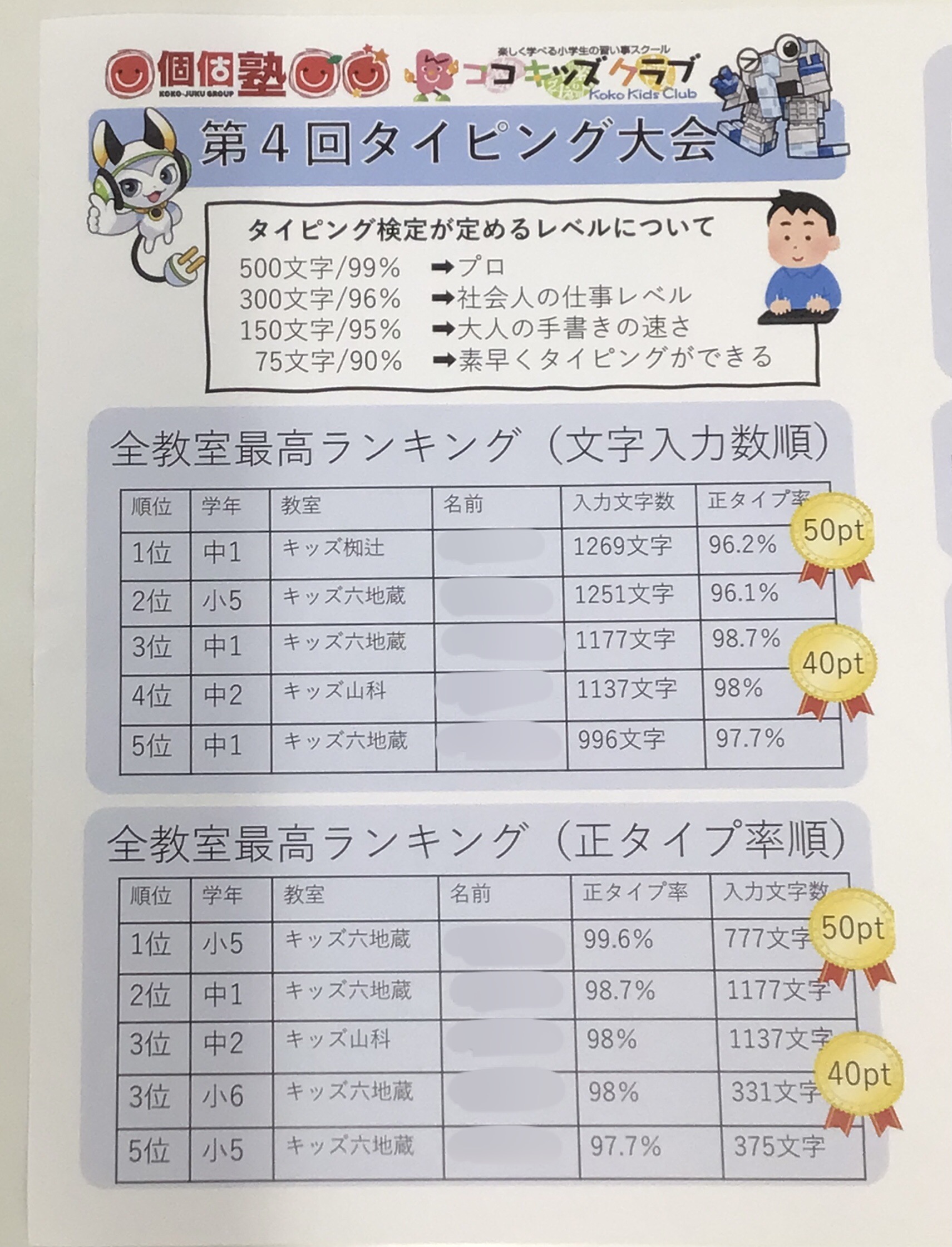 全教室高得点・全教室自己ベスト更新などのランキング表には好成績者が続出✨