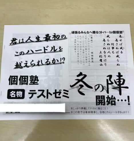 教室ではすでに、受験生に合格するまで帰れないテストゼミこと「冬の陣」を配布し始めています!