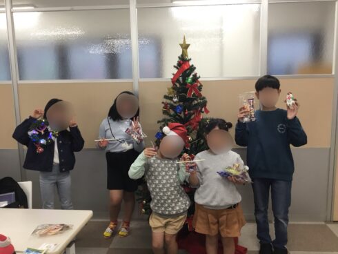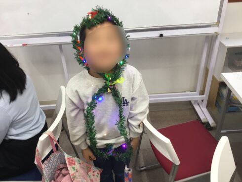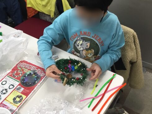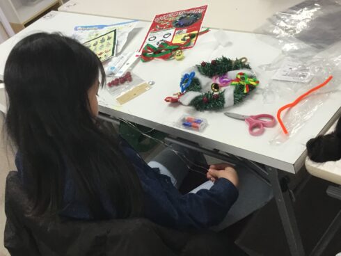 自分で作った飾りやキラキラ光るライトをつけるクリスマスリースを作りました!
