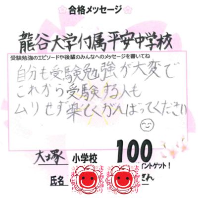 投稿日: 2026/03/10 投稿者: okabayashi 東野教室 合格体験記龍谷大学付属平安中学校合格|大塚小6 Tさん 自分も受験勉強が大変で、これから受験する人もムリせず楽しく頑張ってください(^^) 合格おめでとう!