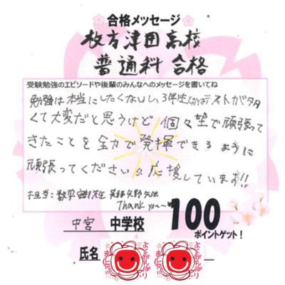 投稿日: 2026/04/02 投稿者: okabayashi 枚方中宮教室 合格体験記大阪府立枚方津田高校(普通科)合格|中宮中3 Nさん 勉強は本当にしたくないし、3年生とかはテストが多くて大変だと思うけど、個個塾で頑張ってきたことを全力で発揮できるように頑張ってください。 応援しています!! 合格おめでとう!