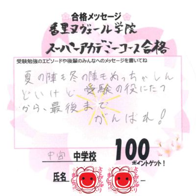 投稿日: 2026/04/02 投稿者: okabayashi 枚方中宮教室 合格体験記香里ヌヴェール学院(スーパーアカデミーコース)合格|中宮中3 Kさん 夏の陣も冬の陣もめっちゃしんどいけど受験の役にたつから、最後までがんばれ! 合格おめでとう!
