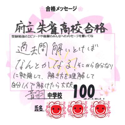 投稿日: 2026/04/022026/04/02 投稿者: okabayashi 山科教室 合格体験記京都府立朱雀高校 合格|音羽中3 Kさん 過去問解いとけばなんとかなる!そこから自分なりに勉強して、解き方を理解して自分1人で解けたら大丈夫。 合格おめでとう!
