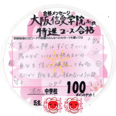 投稿日: 2026/04/02 投稿者: okabayashi 枚方御殿山教室 合格体験記大阪信愛学院高校(特進コース)合格|渚西中3 Kさん 夏・冬の陣はすごくきついと思うけどいつかは終わるから自分を信じて頑張ってね✨ とにかく自分を追い詰めないように!! 合格おめでとう!