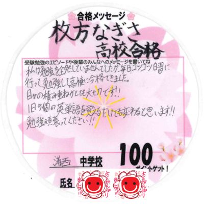 投稿日: 2026/04/02 投稿者: okabayashi 枚方御殿山教室 合格体験記大阪府立枚方なぎさ高校 合格|渚西中3 Nさん 私は勉強を全然していませんでしたが、毎日コツコツ自習に行って、勉強して高校に合格できました。 日々の積み重ねとても大切です!! 1日5個の英単語を覚えるだけでも変わると思います!! 勉強頑張ってください!! 合格おめでとう!