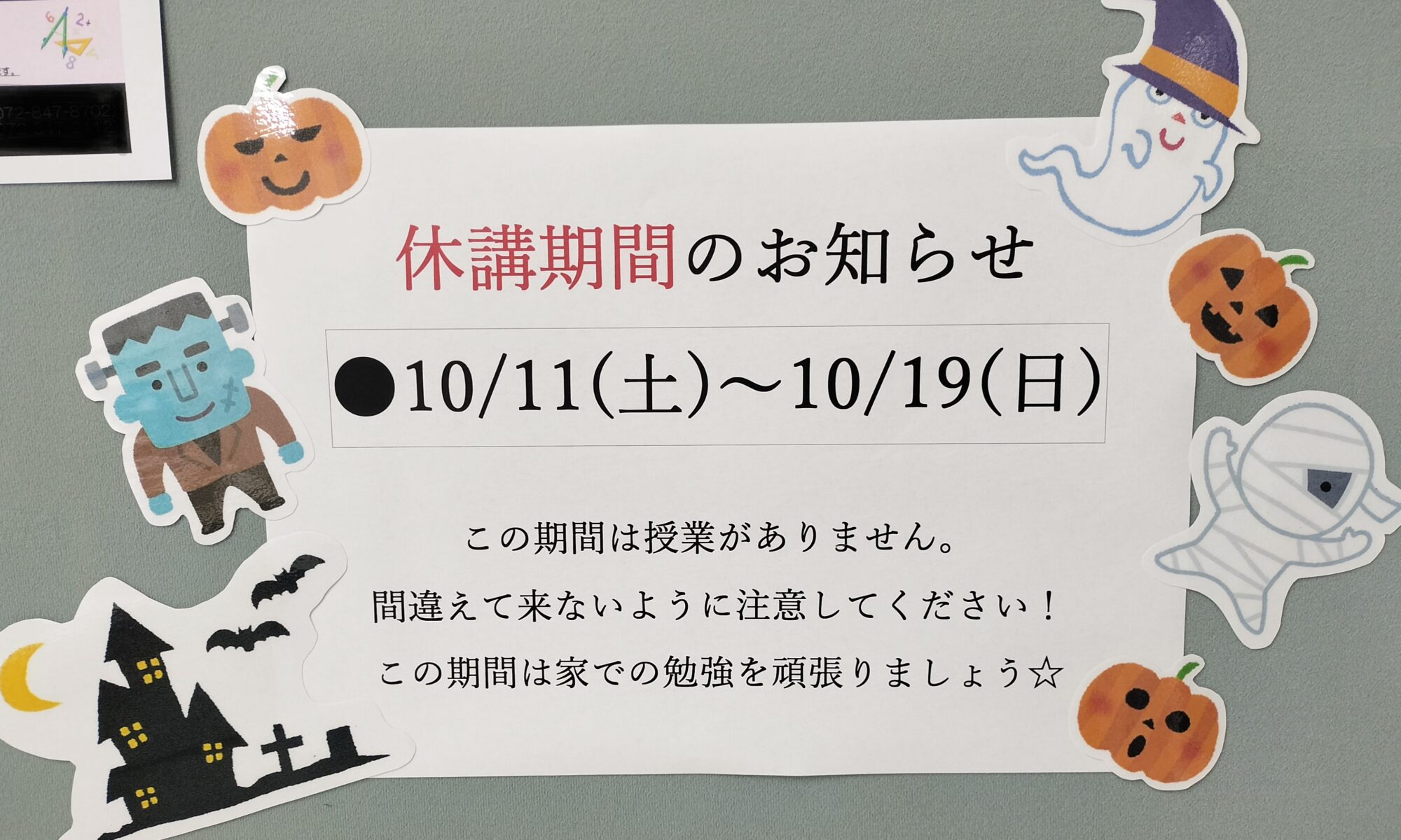 ブログをご覧の皆様こんにちは😊個個塾ひらかた御殿山教室です! 来週10/13(月)~17(金)は通常授業が休講となります🍁 お越し頂いても塾が締まっているので、ご注意ください …